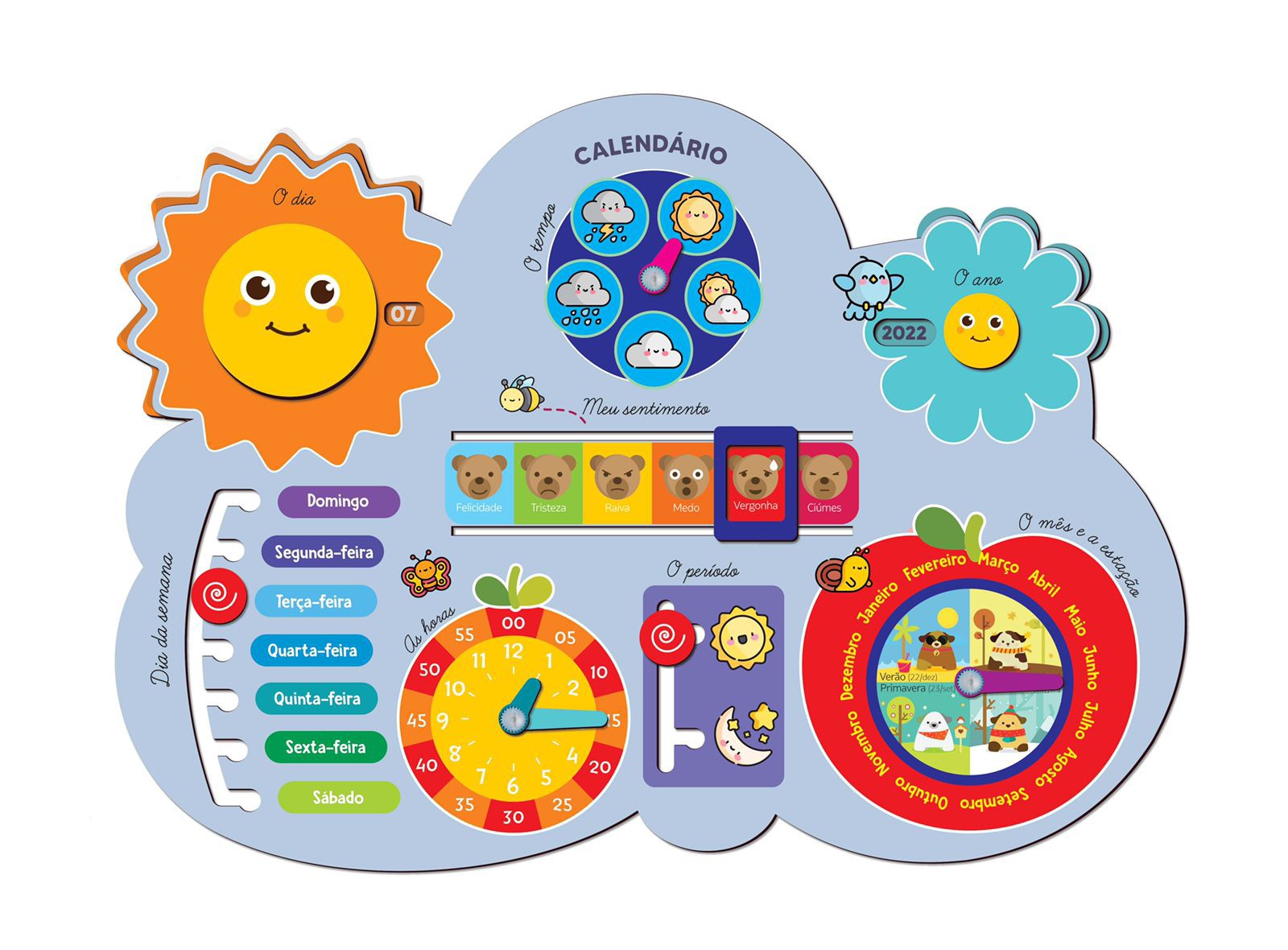 Nosso Calendário Animado ajuda os piticos a se situarem no tempo. Á medida em que elas giram e manuseiam as peças aprendem sobre as horas, dia do mês, da semana, as estações, clima de maneira lúdica e criativa. Informações importantes sobre o produto: Corte a laser, garante acabamento fino, sem rebarbas e cantos vivos, garantindo segurança ao brincar.