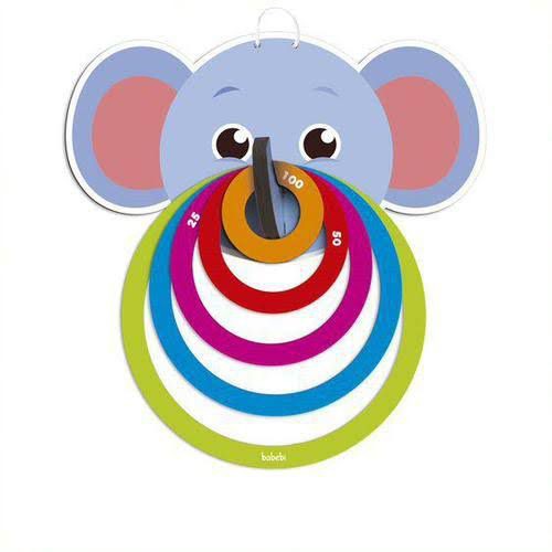 Contém 1 suporte com gancho para fixar na parede em formato de elefantinho, 5 agorlas para lançar.