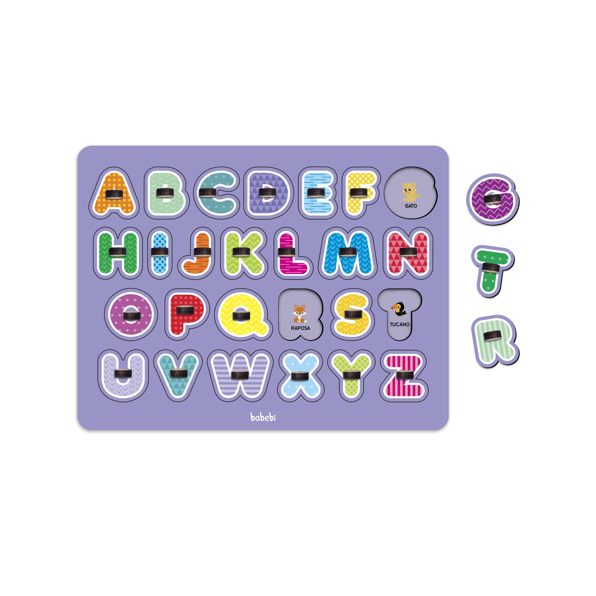Contém: 1 tabuleiro de encaixe, 26 letras com pinos.